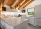 Най-горният етаж на това шале се намира декорирана всекидневна с отворен план. Всеки ъгъл разполага с различно пространство, в което да се отпуснете: кътът с диван и телевизор ви дава възможност да се отпуснете до топлината на дървената камина, зоната за хранене ще приюти удобно вечерните ви ястия, а стилно оборудваната кухня представлява идеално работно пространство за избрания от вас готвач, който да създаде специалитета на вечерта. След като изпробвате всяка зона, можете да излезете на балкона с югозападно изложение, за да заснемете по-отблизо зашеметяващите планински райони около вас.