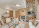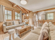Хол с удобни дивани, телевизор с плосък екран и камина.