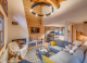 Просторна всекидневна с дивани, фотьойли, маса и камина