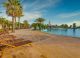 - Открит басейн с шезлонги и чадъри