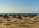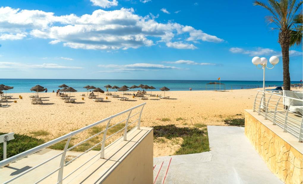 Собствен, пясъчен. Чадъри и шезлонги на плажа и при басейна - безплатно. Плажни кърпи -срещу депозит. Матраци - срещу заплащане.