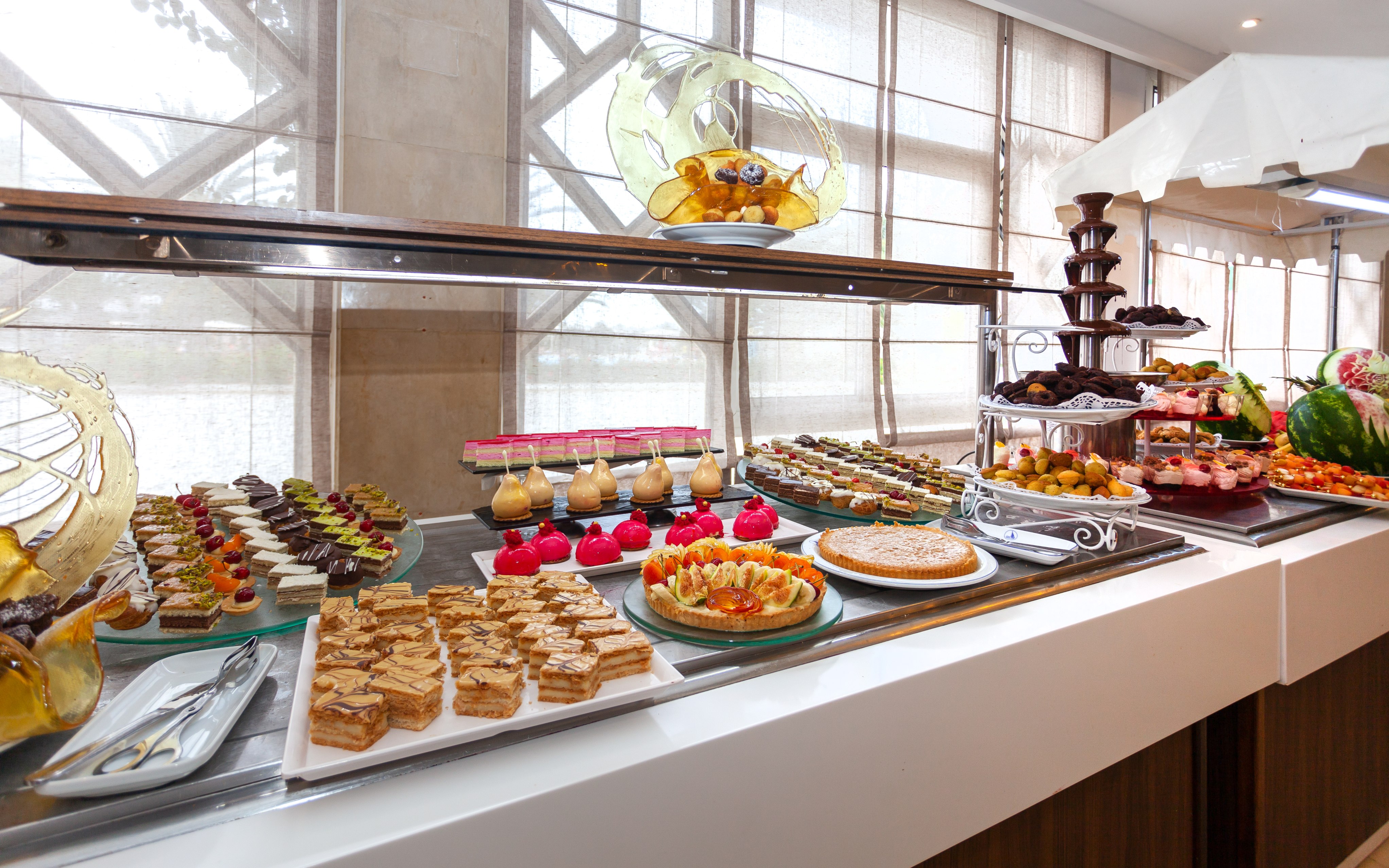 Основен ресторант Mimosa, а ла карт ресторант El Fell (платен, 1 безплатно посещения на престой, след предварителна резервация), барбекю ресторант на плажа, лоби бар Camelia, бар Dahlia (срещу заплащане), бар басейн, бар на плажа, Таласо център, открит басейн, закрит басейн, закрит басейн с морска вода в Таласо центъра (срещу заплащане), анимация, денонощна рецепция, 3 конферентни зали, обмяна на валута, магазин.