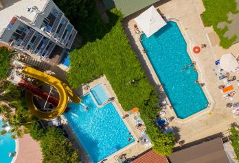 Основен ресторант, а-ла-карт ресторант (срещу допълнително заплащане), бар, 2 открити басейна (80м2 и 100м2), 2 водни пързалки, паркинг. За децата: Детски басейн, детска площадка. Платени услуги - сейф (на рецепция), сауна, турска баня, масажи, пералня, лекар. Безплатни услуги: Интернет (в лоби). ПЛАЖ: Градски, пясъчен – чадъри и шезлонги на плажа – срещу заплащане, а при басейна – безплатно.