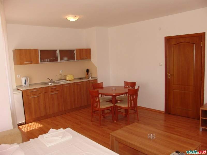 и скрин. Дневната е оборудвана с двоен разтегателен диван, маса за хранене и столове, кухненски кът