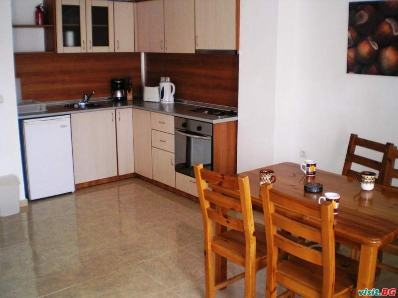 Кухненско обзавеждане:кухненски плот с шкафчета и мивка, хладилник, фурна с котлон, аспиратор, тостер, кафе машина, термо кана, пълен комплект кухненска посуда, порцеланови и стъклени чаши, чинии и прибори.