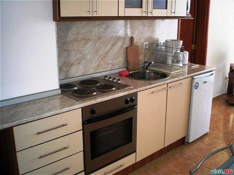 Кухненско обзавеждане:кухненски плот с шкафчета и мивка, хладилник, фурна с котлон, аспиратор, тостер, кафе машина, термо кана, пълен комплект кухненска посуда, порцеланови и стъклени чаши, чинии и прибори