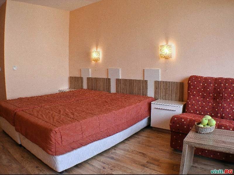 стаи с квадратура от 25 кв.м, студио с квадратура 30 кв.м, с мека разтегателна мебел и големи тераси с частична гледка към морето и басейна.