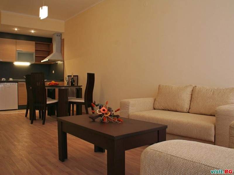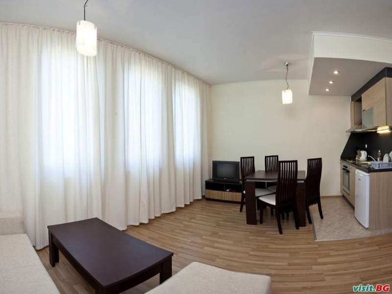 Апартамент: Апартаментите са с минимална площ от 44 кв.м, модерно обзавеждане, дневна, напълно оборудван с техника и съдове кухненски бокс, отделна спалня, баня, с или без тераса, в зависимост от местоположението. Подходящи са за семейни почивки и настаняване на деца. Спалня - Спалня, две нощни шкафчета, малко бюро, табуретка, огледало, голям гардероб. Дневна -